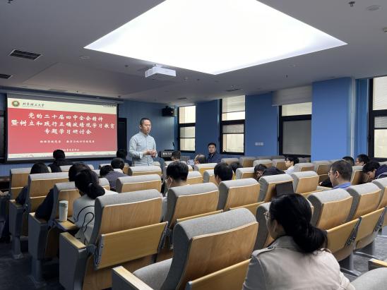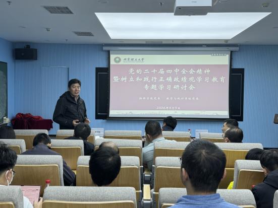 为深入学习贯彻党的二十届四中全会精神,推动树立和践行正确政绩观学习教育走深走实,促进理论学习与学科发展深度融合,2026 年 4 月 9 日,数学与统计学院、物理学院在文萃 E708 报告厅联合举办党的二十届四中全会精神暨树立和践行正确政绩观学习教育专题学习研讨会。两学院相关领导、教师党支部书记及教师党员代表参加会议,会议由数学与统计学院党委书记邹锐主持。